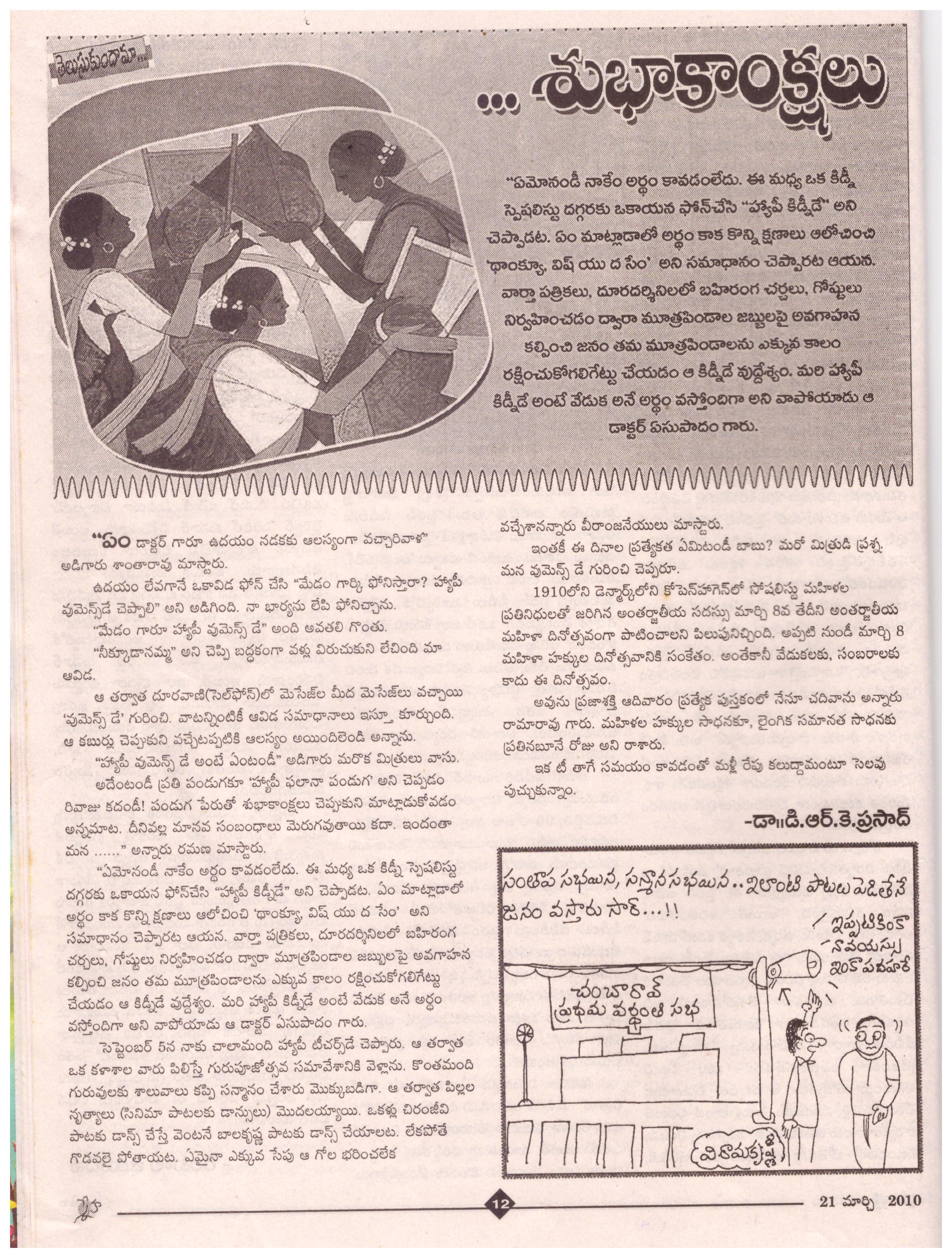 “ఏమోనండీ, నాకేం అర్థం కావడం లేదు. ఈమధ్య ఒక కిడ్నీ స్పెషలిస్టు దగ్గరకు ఒకాయన ఫోన్ చేసి “హ్యాపీ కిడ్నీ డే” అని చెప్పాడట. ఏం మాట్లాడాలో అర్థం కాక కొన్ని క్షణాలు అలోచించి ‘థాంక్యూ, విష్ యు ద సేం’ అని సమాధానం చెప్పారట ఆయన. వార్తా పత్రికలూ, దూరదర్శినిలలో బహిరంగ చర్చలు, గోష్టులు నిర్వహించడం ద్వారా మూత్రపిండాల జబ్బులపై అవగాహన కల్పించి జనం తమ మూత్రపిండాలను ఎక్కువ కాలం రక్షించుకోగలిగేట్లు చేయడం ఆ కిడ్నీ డే ఉద్దేశ్యం. మరి హ్యాపీ కిడ్నీ డే అంటే వేడుక అనే అర్థం వస్తోందిగా అని వాపోయాడు ఆ డాక్టర్ ఏసుపాదం గారు”.