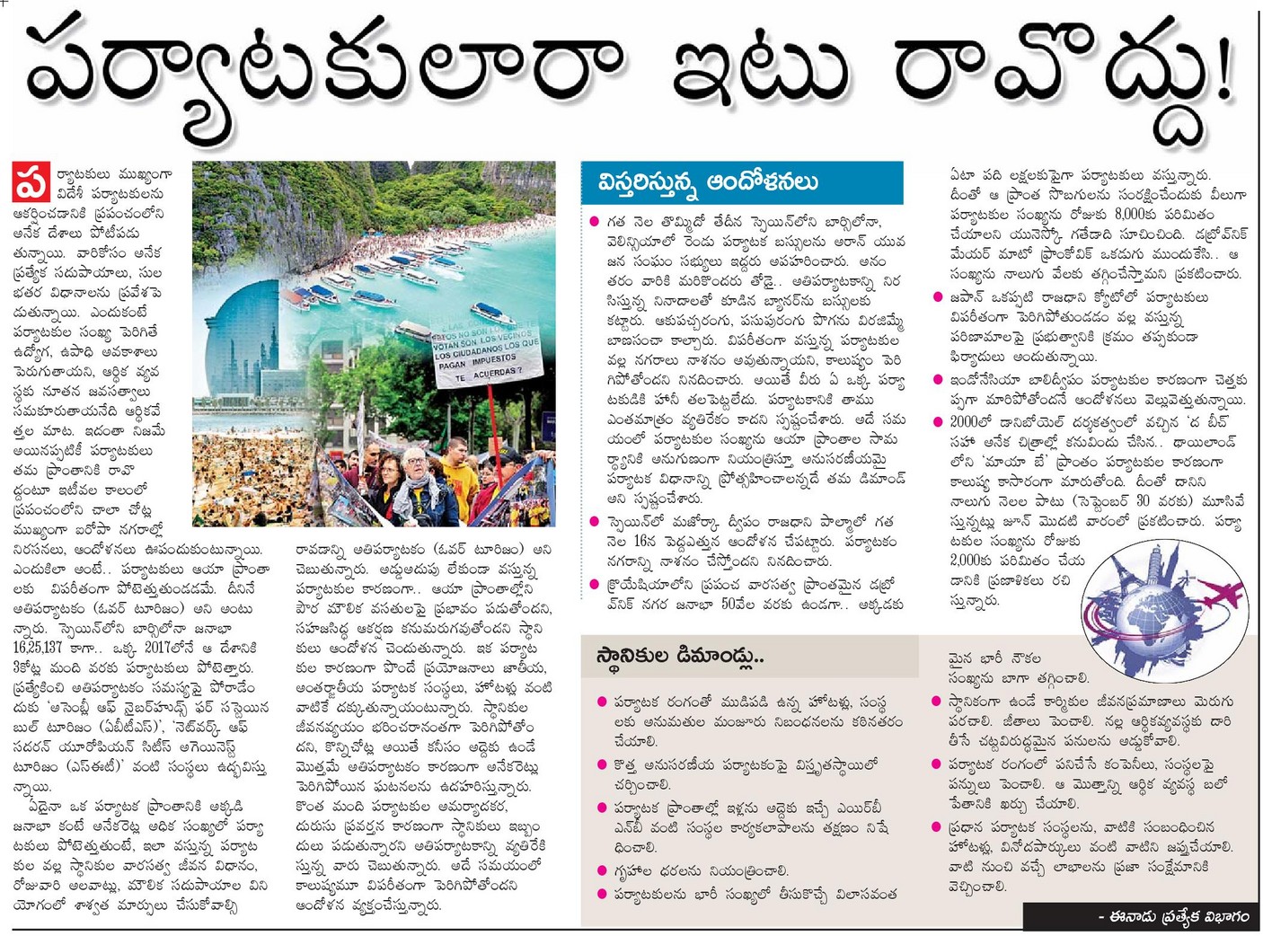 ఇవి కాక అతి పర్యాటకం వలన వచ్చే అనేక ఇతర సమస్యలు కూడా పర్యాటక రంగంలో ఉన్నాయి. పర్యావరణహితంగా, స్థానికులకు ఇబ్బంది కలిగించకుండా ఉండేటట్లుగా పర్యాటకరంగానికి తగిన మార్గదర్శకాలు రూపొందించి అమలుచెయ్యాలి. ఇటీవల ఈ విషయంపై ఈనాడు దినపత్రిక లో వచ్చిన ఈ వార్త చదవండి. మీ సలహాలు కూడా రాయగలరు.