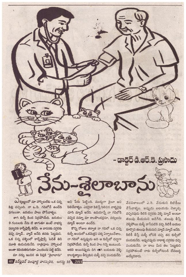 ఎక్కణ్ణించో మా హాస్పిటల్ కు ఒక చిన్న పిల్లి వచ్చింది.నా ఒ.పి.లోనే వుండేది పగలంతా. ఉదయం పాలు పోసేవాళ్ళం. తాగి కుర్చీ కింద నిద్రపోయేది . ఉదయం 9 గంటలకు నేను టీ తాగుతూ ఉంటే, నా భార్య పద్మావతి కార్న్ ఫ్లేక్స్ తినేది. ఆ వాసనకు దగ్గరకు వచ్చి మ్యావ్..మ్యావ్ అనేది తనకు పెట్టమని. ఒక చిన్న పళ్ళెంలో కార్న్ ఫ్లేక్స్ పెడితే, తిని మూతి తుడుచుకునేది. కాలకృత్యాలు తీర్చుకోవలసి వచ్చినప్పుడు కిటికీలో నుంచి బయటకువెళ్లి మళ్ళీ ఒ.పి. గదిలోనికి వచ్చి పండుకునేది. రాత్రిపూట హాస్పిటల్ అంతా కలియ తిరుగుతూ ఎలుకలను పట్టి తినేది.