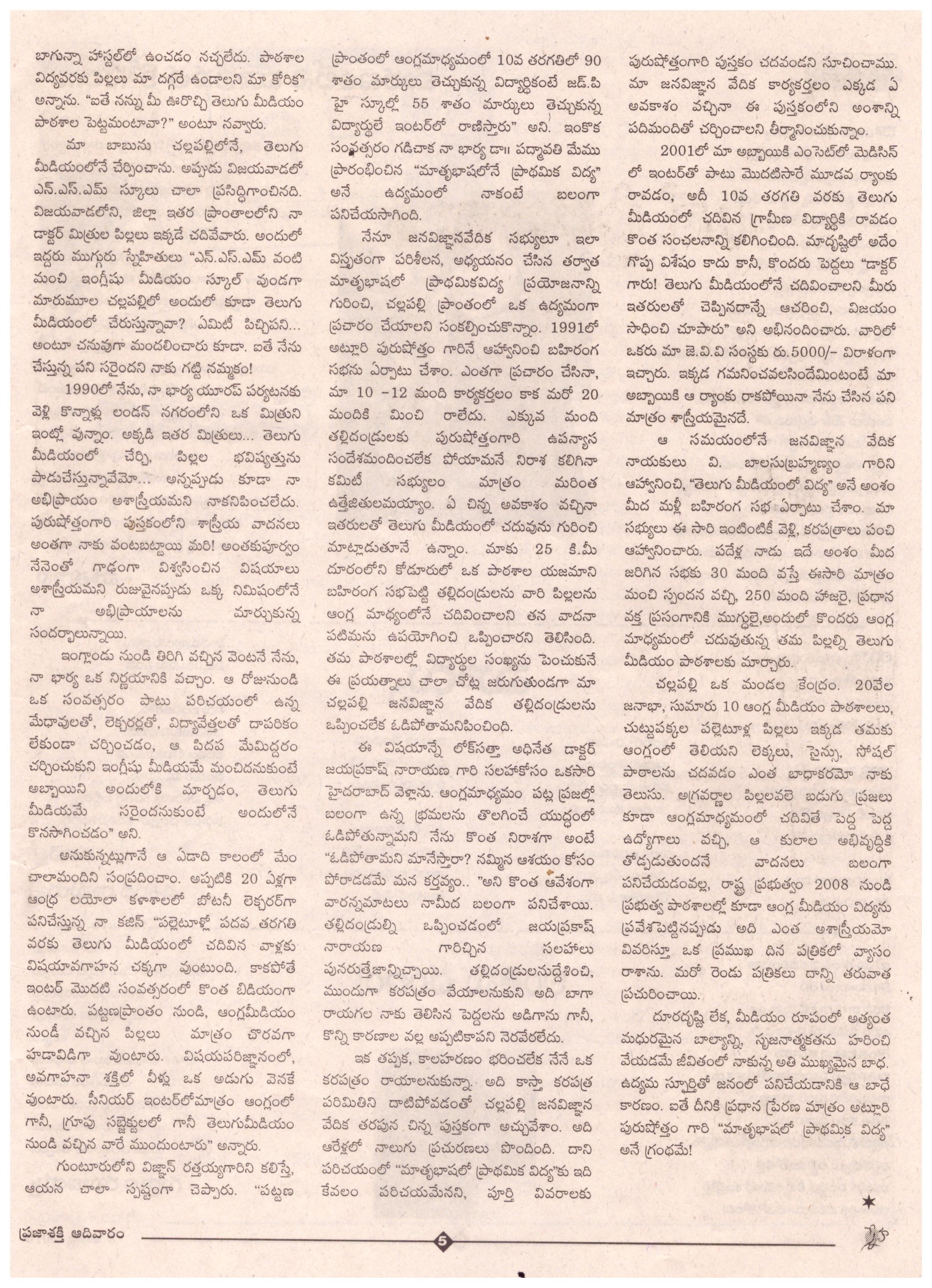 ఈ విషయాన్నే లోక్ సత్తా అధినేత డాక్టర్ జయప్రకాష్ నారాయణ గారి సలహా కోసం ఒకసారి హైదరాబాద్ వెళ్లాను. ఆంగ్లమాధ్యమం పట్ల ప్రజల్లో బలంగా ఉన్న భ్రమలను తొలగించే యుద్ధంలో ఓడిపోతున్నామని నేను కొంత నిరాశగా అంటే, “ఓడిపోతామని మానేస్తారా? నమ్మిన ఆశయం కోసం పోరాడడమే మన కర్తవ్యం…” అని కొంత ఆవేశంగా వారన్న మాటలు నామీద బలంగా పనిచేశాయి. తల్లిదండ్రుల్ని ఒప్పించడంలో జయప్రకాష్ నారాయణ గారిచ్చిన సలహాలు పునరుత్తేజాన్నిచ్చాయి. తల్లిదండ్రుల నుద్దేశించి, ముందుగా కరపత్రం వేయాలనుకుని అది బాగా రాయగల నాకు తెలిసిన పెద్దలను అడిగాను గానీ, కొన్ని కారణాల వల్ల అప్పటికా పని నెరవేరలేదు.