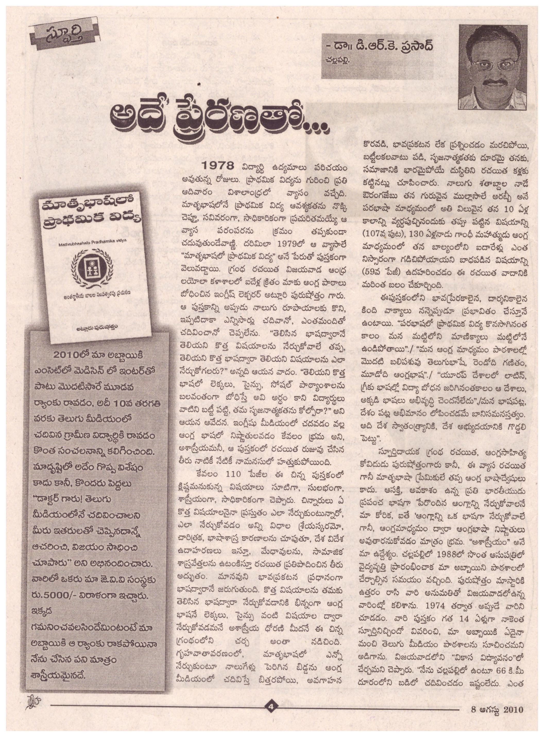 2001లో మా అబ్బాయికి ఎంసెట్ లో మెడిసిన్ లో మొదటిసారే మూడవ ర్యాంకు రావడం, అదీ 10వ తరగతి వరకు తెలుగు మీడియంలో చదివిన గ్రామీణ విద్యార్థికి రావడం కొంత సంచలనాన్ని కలిగించింది. మా దృష్టిలో అదేమీ గొప్ప విశేషం కాదు కానీ, కొందరు పెద్దలు “డాక్టర్ గారు! తెలుగు మీడియంలోనే చదివించాలని మీరు ఇతరులతో చెప్పినదాన్నే ఆచరించి, విజయం సాధించి చూపారు” అని అభినందించారు. వారిలో ఒకరు మా జె.వి.వి. సంస్థకు రు. 5000/- విరాళంగా ఇచ్చారు. ఇక్కడ గమనించవలసిందేమిటంటే మా అబ్బాయికి ఆ ర్యాంకు రాకపోయినా నేను చేసిన పని మాత్రం శాస్త్రీయమైనదే.