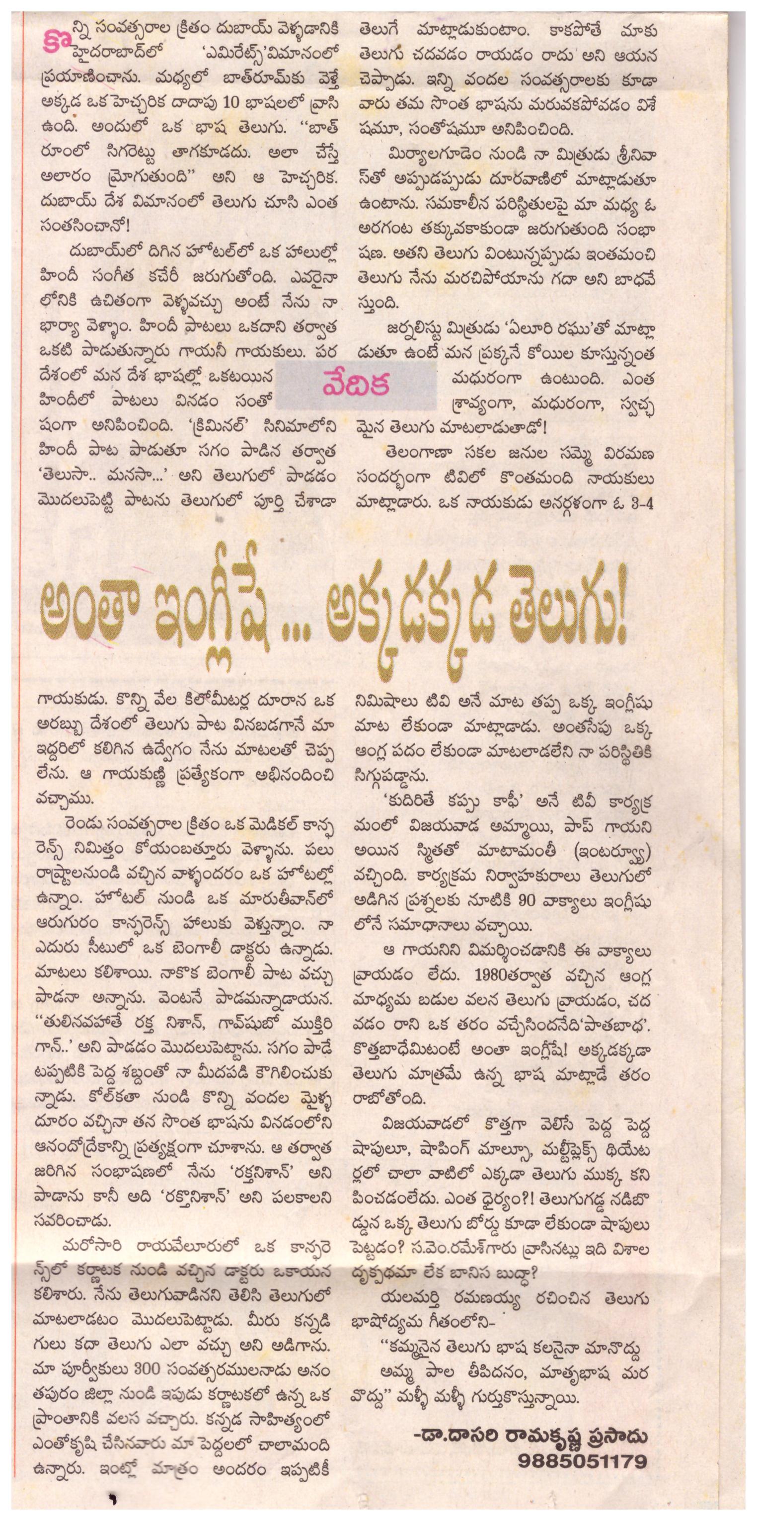 “అంతా ఇంగ్లీషే… అక్కడక్కడా తెలుగు” పేరుతో 26-5-2012 న ఆంధ్రభూమిలో ప్రచురించబడినది.